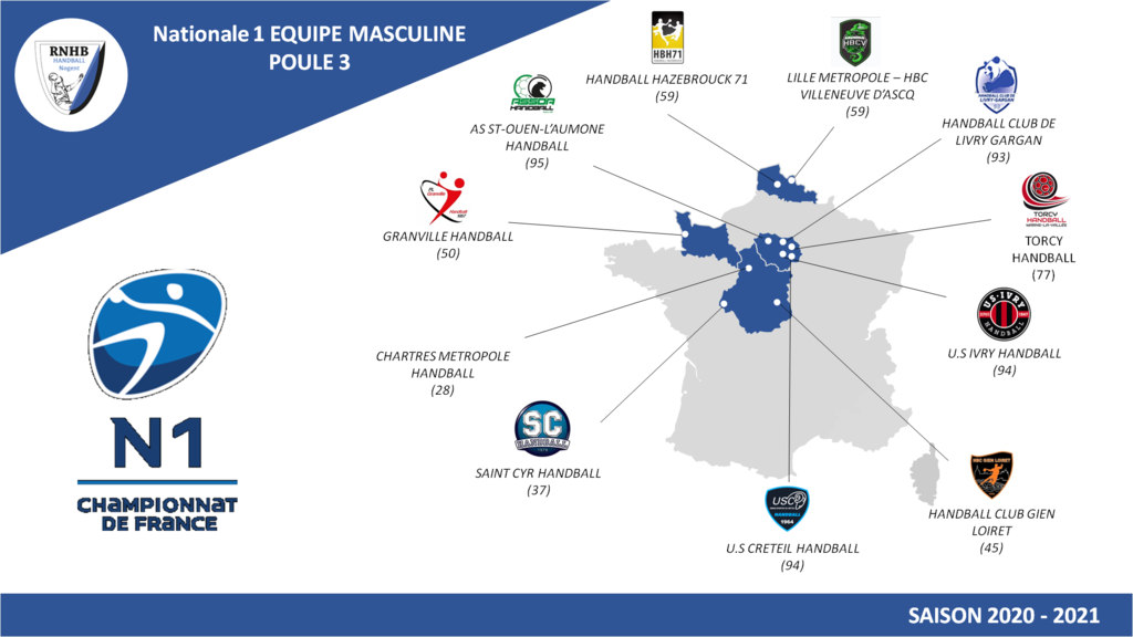 Vous trouverez ci-joint la carte des équipes de la poule 3 du championnat de france de Nationale 1 où évolue notre équipe première